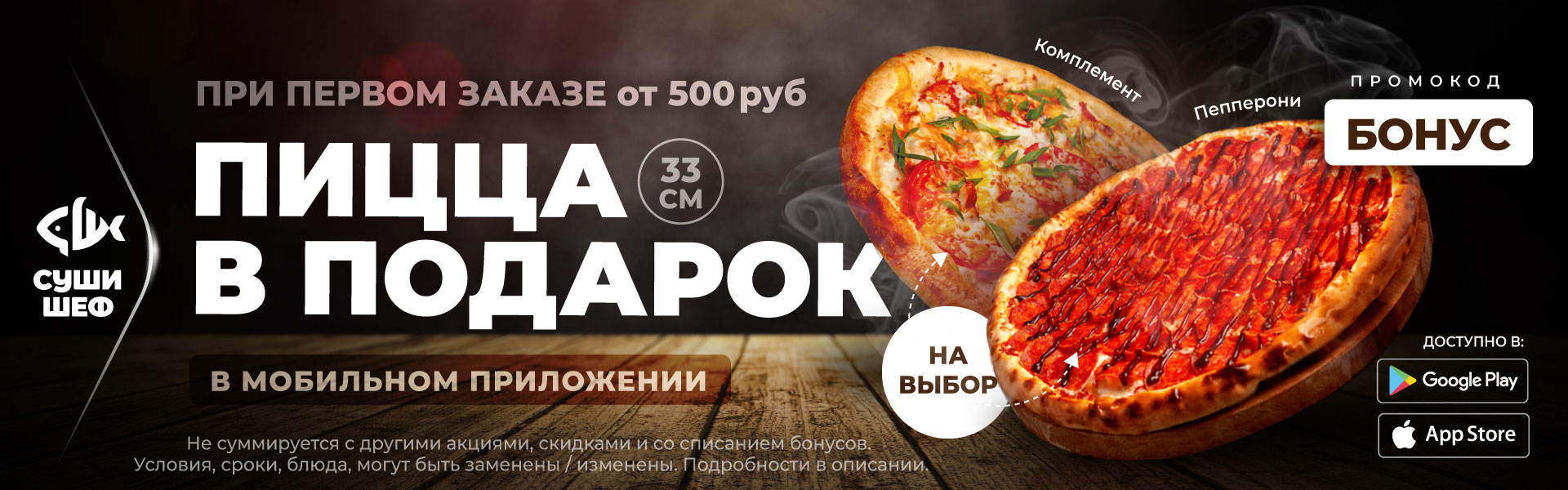 Дарим пиццу 33 см в подарок при первом заказе через мобильное приложение.